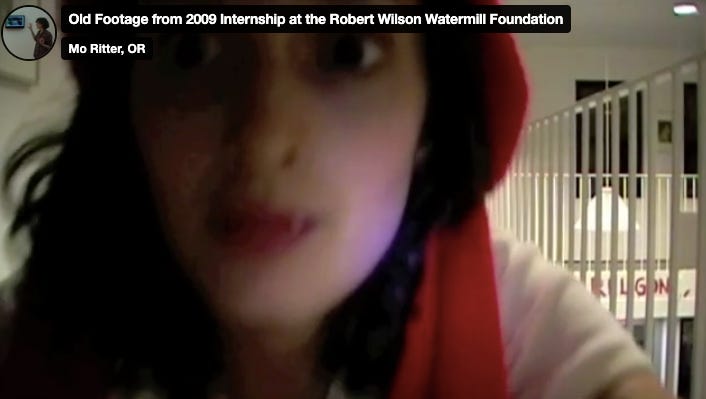 A 22-year-old in 2011, I was interning as an Archives Assistant at the Robert Wilson Watermill Center archives/ office in DUMBO, New York and had the strange privilege of staying periodically in the Watermill Center’s mansion sort of massive art center place in the Hamptons. Heard tell of some drama with the gardener which intrigues me as an outsider. As a young artist and arts worker, this was a very formative time, because of the caliber of arts, and because of the total culture shock of being tossed into the very wealthy New York art world. I think the gardener and one other assistant were the only folks onsite, at the Watermill Center. I remember nights spent sliding theatrically on polished floors of long hallways in socks, past Paul Thek neon acrylic box sculptures cradling some kind of visceral dismembered hand. Pausing in my psycho trajectories, doing silent facetime one-on-one with the objects. Spontaneous yoga/ sort of haphazardly and honestly tossing my body around in the space, kerplunk. Running through. Running away from? Running to? These memories are more vivid because I have strange diaristic video footage from my mini-dv camera, proof. Buckle up, but if anyone from the Watermill team reads this, please forgive my sometimes eccentric impulses. I remember staring I think at a Sol Lewitt chair for a long time without much reference to his work. Also, maybe talking to the video camera, which makes me think a bit of early wave reality tv. I think during this time I was hired to help direct patrons to their seats for a Robert Wilson Watermill Gala, and there was an alien coldness and rudeness exuding off the body of the legend Marina Abramovic, I am sorry. There were performance happenings within small spaces and I remember a male stripper performance really making an impression probably because I never saw that kind of thing and trying to understand the layers of it.